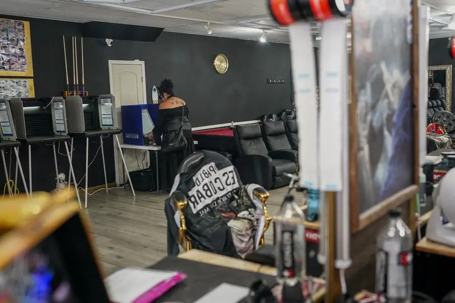 A person votes at a polling place set up inside a hair salon during the Super Tuesday primary election in San Francisco, California, U.S. March 5, 2024. REUTERS/Loren Elliott