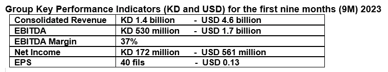 In Q3 2023, Zain generated consolidated revenue of KD 485 million (USD 1.6 billion), up 10% YoY. EBITDA for the quarter reached KD 183 million (USD 594 million), an increase of 7% YoY, reflecting a 38% EBITDA margin. Net income for the three months amounted to KD 60 million (USD 196 million), a 11% increase YoY. Earnings per share for Q3 amounted to 14 fils (USD 0.05).